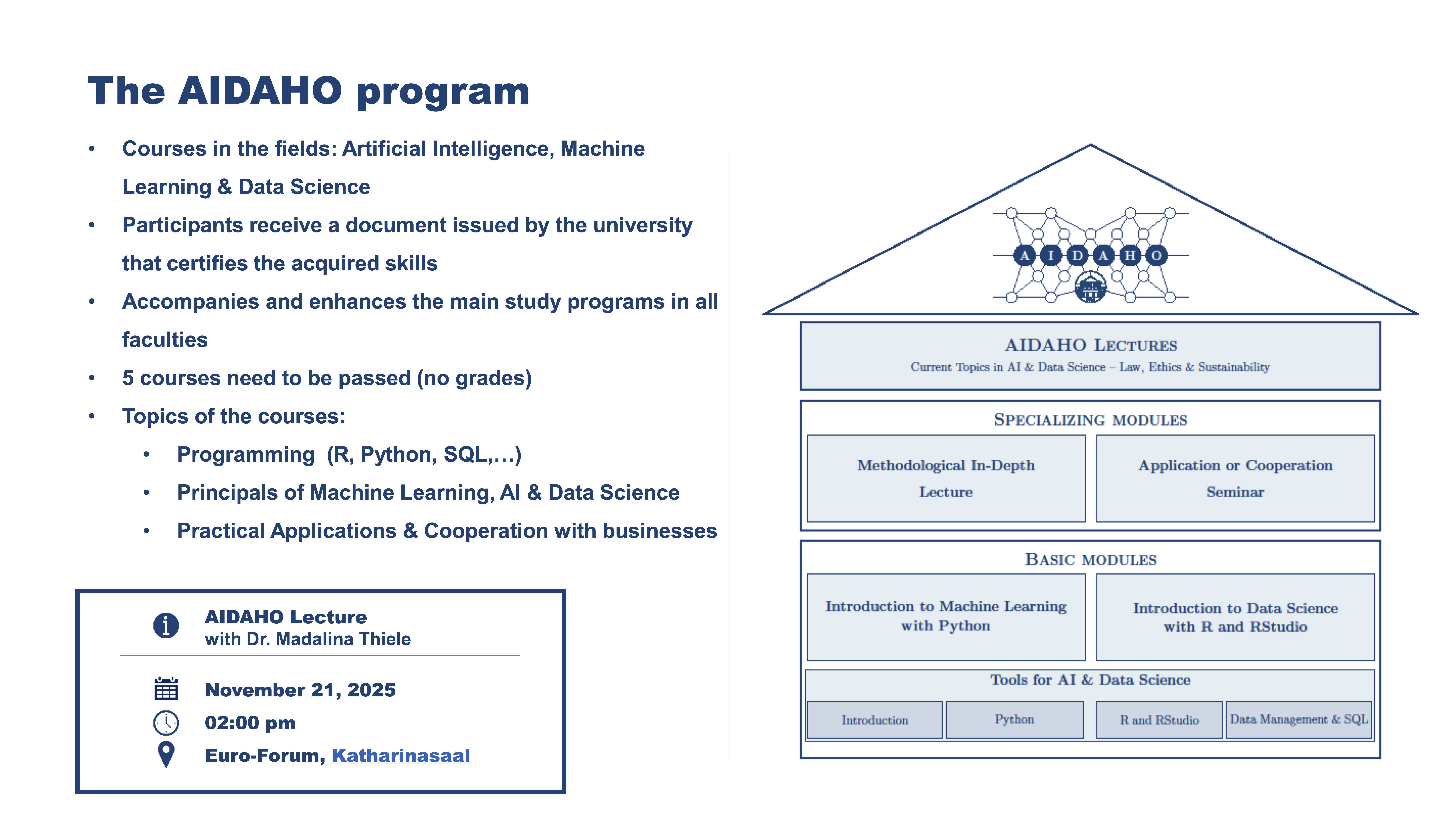 At the University of Hohenheim, students can acquire technical knowledge on Data Science and using artificial intelligence for scientific research in the AIDAHO program, which is described here: https://aidaho.uni-hohenheim.de/en. Figure 8 shows the courses that are offered to acquire the certificate.