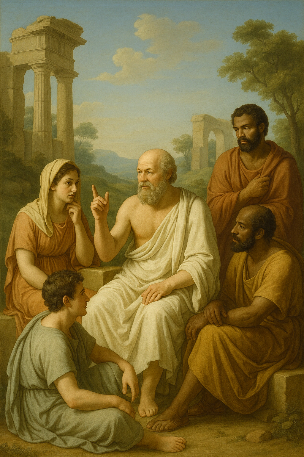 In that respect, modern-day academic teaching is based on the utilization of state of the art technological tools such as generative AI, but also to the classical academia of Ancient Greece, where students discuss with their teacher in groups (Figure 7).