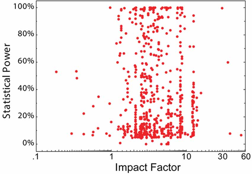 Quantitative analyses of the statistical power of studies (which is a measure for the quality of the underlying experimental design) and the journal impact factor (IF) in which the research was published revealed a low or no correlation between both measures. This is shown in Figure 2 for the field of neuroscience. Therefore, if the statistical power of a study is taken as a measure of the quality (and reproducibility) of a study, the impact factor is clearly not correlated to its quality.