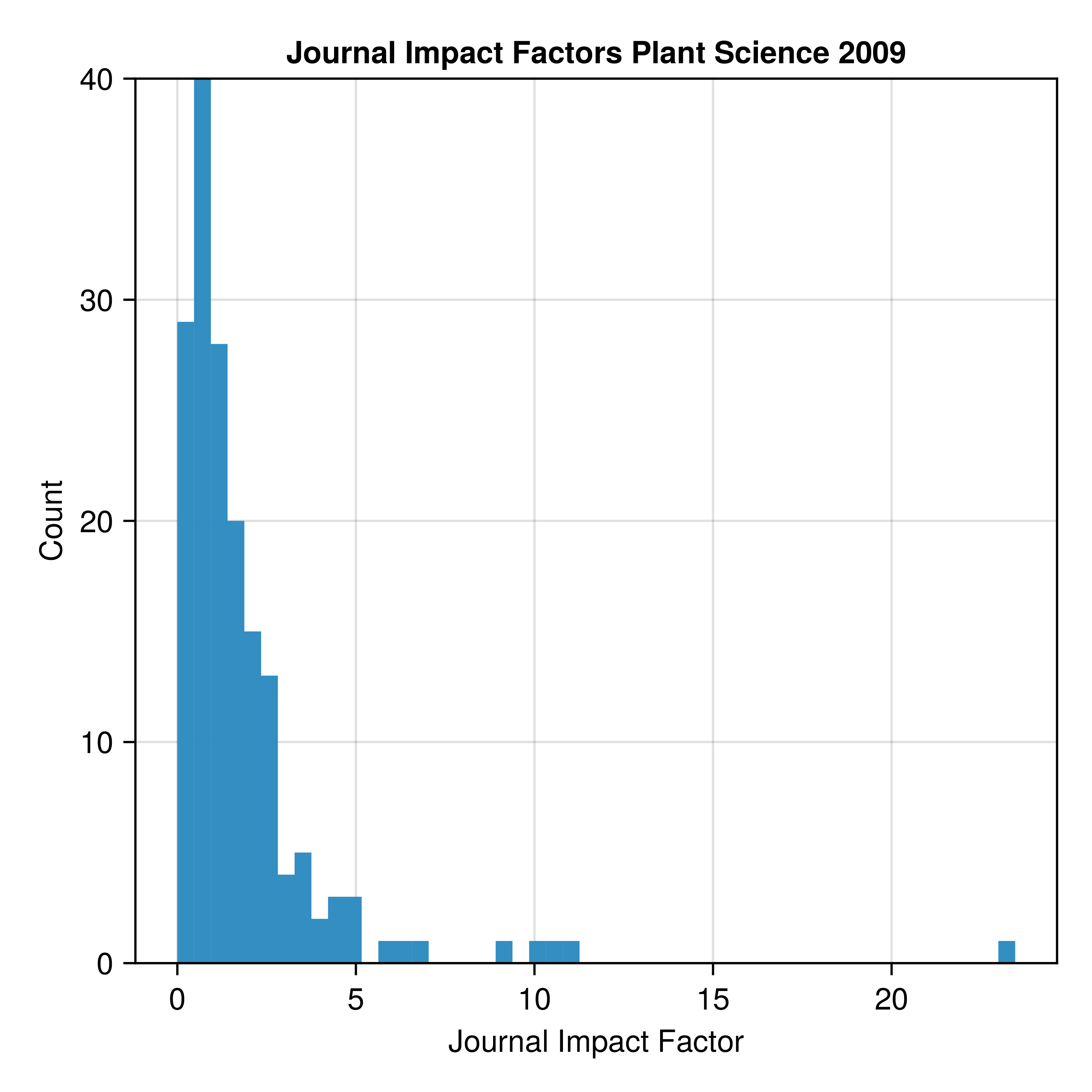 The distribution is log-normal, which indicates that most journals have a rather low impact, and only very few journals have a high impact factor. The top five journals in the figure are review journals: Annual review of Plant Biology, Annual Review of Phytopathology, Current Opinion on Plant Biology, Trends in Plant Science. These journals only publish review papers and no original research. The first journal with mainly original research papers is Plant Cell with an impact factor of 9.88.